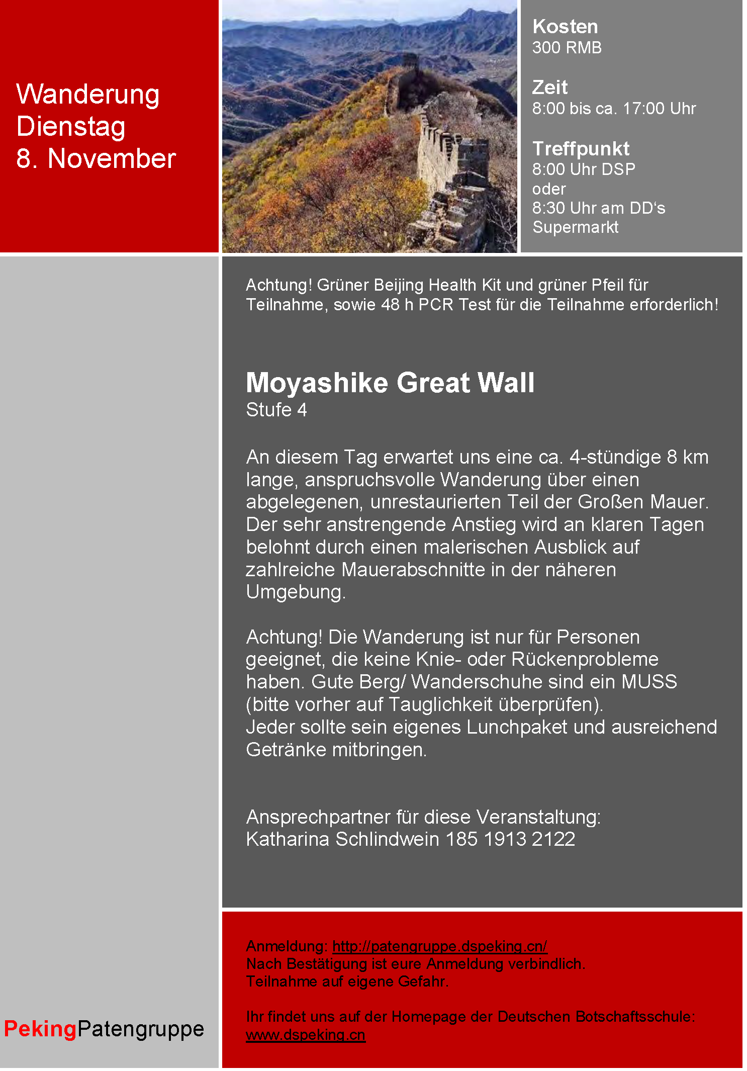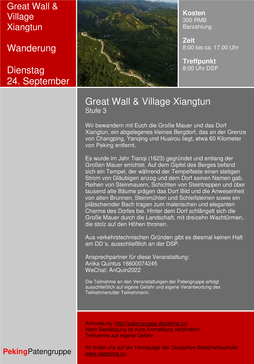 Alle Veranstaltungstermine findet ihr unter "Veranstaltungen der Patengruppe" und auf der Homepage der Deutschen Botschaftsschule Peking. Dort erhaltet ihr auch weitere Informationen und viele nützliche Tipps rund um das Leben in Peking.